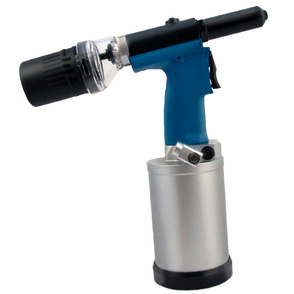 Meet the new generation of riveting tools. The BP-4V riveter is a combination of all the most useful features. The BP-4V riveting tool has the best weight to power ratio in the industry, boasting 3500lbs of pulling force. It can set 1/8,5/32, 3/16 and 1/4 rivets in all Alloys, including Monobolt and Magna-lok structural rivets, most in one stroke. The BP-4V Rivet Gun is super light weight, allowing the rivet gun to be operated continually with great comfort. The rivet tool is expertly designed too. Look no further for the best in ergonomics, balance and comfort. This tool has a convenient, thumb-operated on/off vacuum control switch to control compressor air consumption while it holds the rivet in place in the nose tip. Rivet tool comes complete with nose tips for 1/8, 5/32, 3/16 and 1/4. Also included are wrenches for service and oil applicator. Recommended operating air pressure is 80-95psi. Weight 3.6 lbs.